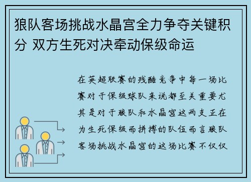 在英超联赛的残酷竞争中,每一场比赛对于保级球队来说都至关重要,尤其是对于狼队和水晶宫这两支正在为生死保级而拼搏的队伍而言。狼队客场挑战水晶宫的这场比赛,不仅仅是一次普通的对决,更是决定两队是否能够在接下来的赛季中继续留在英超的重要时刻。两队的积分差距极小,每一分的得失都可能影响到他们的保级命运。双方在赛季的关键时刻展开生死对决,意义重大,几乎决定了整个赛季的走向。本文将从四个方面深入分析这场比赛的重要性,包括:双方的现状分析、对球队的战术要求、关键球员的发挥、以及比赛可能对保级产生的深远影响,旨在通过细致的剖析,揭示这场对决的真正意义。